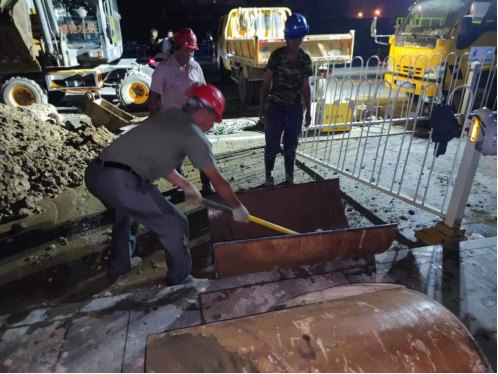 在快速挖開路面找出供水主管道后,經(jīng)技術人員現(xiàn)場分析判斷,確定此次DN600供水主管道被施工損壞是因孝武大道道路改造施工導致,其施工人員操作啄木鳥時不慎將水泥供水管道挖破。隨后技術人員迅速制定了維修方案,即采用DN800鋼管抱箍,快速水泥填充的方式修復。為縮減搶修時間,運行維護部共派出各類工程車輛5輛,搶修人員18名參與到此次搶修任務中。盡管已到深夜,氣溫仍接近30攝氏度,但搶修人員不顧疲勞和炎熱,搶時間、趕進度,通宵作戰(zhàn),終于在11日早上6點完成搶修任務,順利通水。