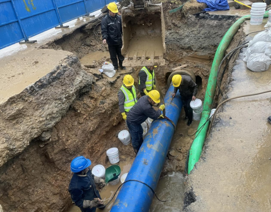 險情就是命令,凌晨1點,公司立即組織10余名搶修人員到場關閘止水。與此同時,技術人員、施工人員和設備設施“跑步前進”、同步到場,對破損溢水點進行邊開挖、邊診斷。為加快搶修速度,減少對周邊用戶的影響,30余名搶修人員頂著嚴寒天氣連夜搶修。